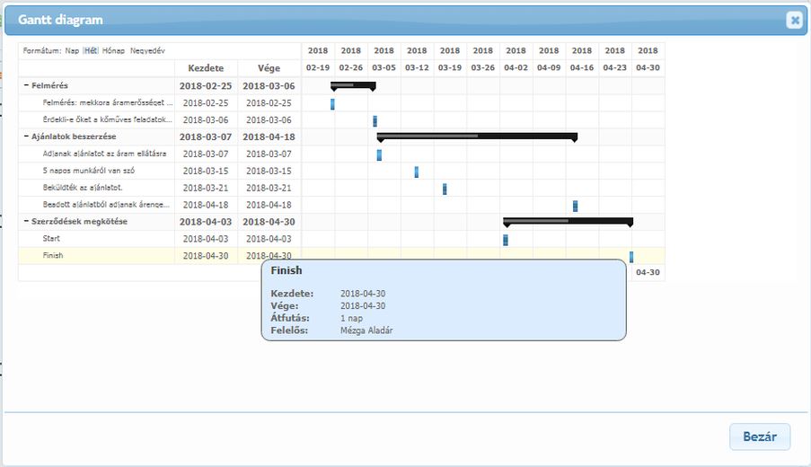 A projekt Mérföldkövek füle alatt található a Gantt diagram nyomógomb. Hatására a mérföldkövek alatt lévő feladatok jelennek meg egy idővonalon. Azok a mérföldkövek, amelyeket végrehajtottunk, az alapértelmezett képernyőn nincsenek részletezve, de egy kattintással kinyithatók. A felső sarokban lehet megválasztani az idővonal felbontását: napi, heti, havi, negyedéves.