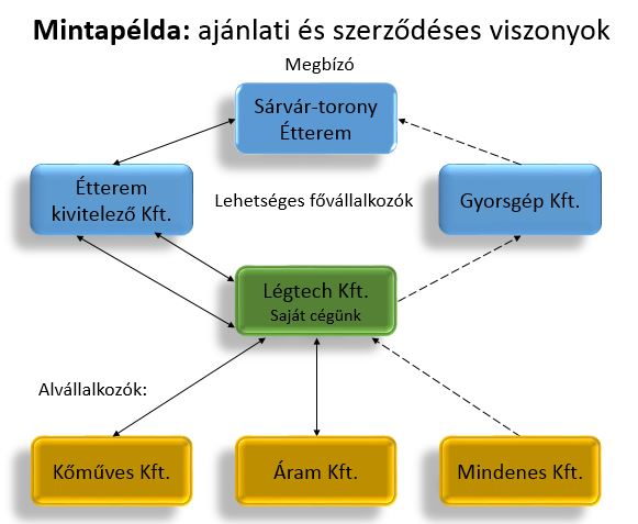 Általunk ismert két cég is indul fővállalkozóként a pályázaton: Étterem Kivitelező Kft. és Gyorsgép Kft. Mindkét céggel dolgoztunk már korábban, így cégünk menedzsmentje úgy dönt, hogy mindkét cégnél bejelentkezünk alvállalkozóként.